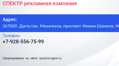СПЕКТР, рекламная компания по адресу 367029, Дагестан, Махачкала, проспект Имама Шамиля, 48 в дальнейшем Организация, размещена в следующих категориях: