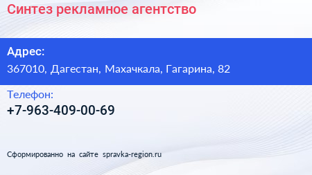 Синтез, рекламное агентство по адресу 367010, Дагестан, Махачкала, Гагарина, 82 в дальнейшем Организация, размещена в следующих категориях:
