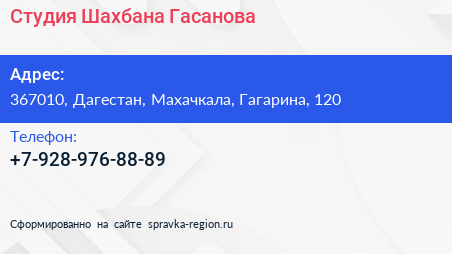 Студия Шахбана Гасанова по адресу 367010, Дагестан, Махачкала, Гагарина, 120 в дальнейшем Организация, размещена в следующих категориях: