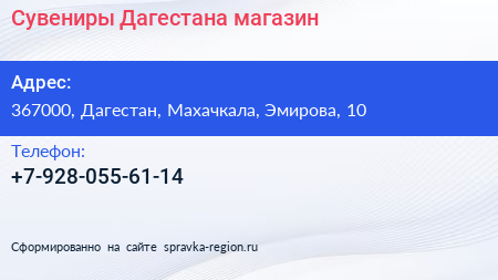 Сувениры Дагестана, магазин по адресу 367000, Дагестан, Махачкала, Эмирова, 10 в дальнейшем Организация, размещена в следующих категориях: