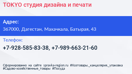 TOKYO, студия дизайна и печати по адресу 367000, Дагестан, Махачкала, Батырая, 43 в дальнейшем Организация, размещена в следующих категориях: