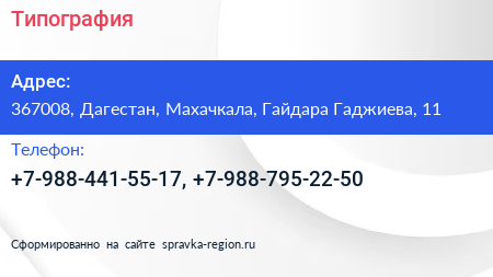 Типография по адресу 367008, Дагестан, Махачкала, Гайдара Гаджиева, 11 в дальнейшем Организация, размещена в следующих категориях: