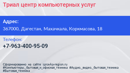 Триал, центр компьютерных услуг по адресу 367000, Дагестан, Махачкала, Коркмасова, 18 в дальнейшем Организация, размещена в следующих категориях: