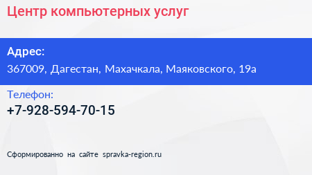 Центр компьютерных услуг по адресу 367009, Дагестан, Махачкала, Маяковского, 19а в дальнейшем Организация, размещена в следующих категориях:
