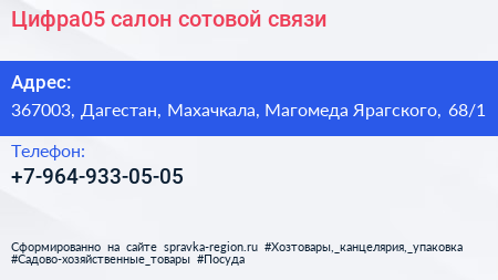 Цифра05, салон сотовой связи по адресу 367003, Дагестан, Махачкала, Магомеда Ярагского, 68/1 в дальнейшем Организация, размещена в следующих категориях: