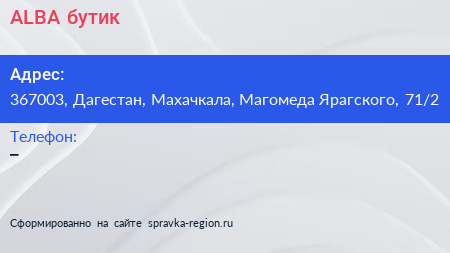 ALBA, бутик по адресу 367003, Дагестан, Махачкала, Магомеда Ярагского, 71/2 в дальнейшем Организация, размещена в следующих категориях: