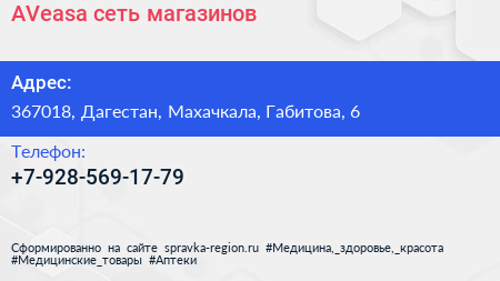 AVeasa, сеть магазинов по адресу 367018, Дагестан, Махачкала, Габитова, 6 в дальнейшем Организация, размещена в следующих категориях: