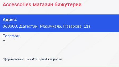Accessories, магазин бижутерии по адресу 368300, Дагестан, Махачкала, Назарова, 11з в дальнейшем Организация, размещена в следующих категориях: