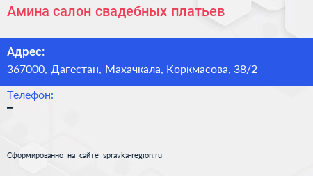 Амина, салон свадебных платьев по адресу 367000, Дагестан, Махачкала, Коркмасова, 38/2 в дальнейшем Организация, размещена в следующих категориях: