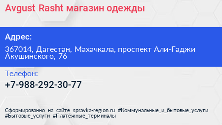 Avgust Rasht, магазин одежды по адресу 367014, Дагестан, Махачкала, проспект Али-Гаджи Акушинского, 76 в дальнейшем Организация, размещена в следующих категориях: