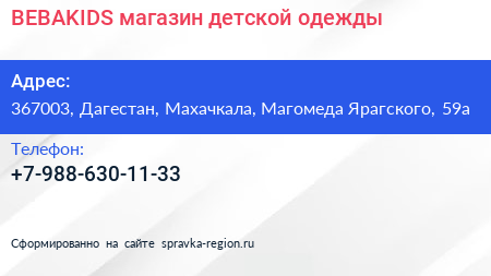 BEBAKIDS, магазин детской одежды по адресу 367003, Дагестан, Махачкала, Магомеда Ярагского, 59а в дальнейшем Организация, размещена в следующих категориях: