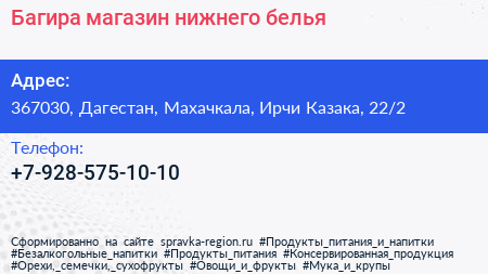 Багира, магазин нижнего белья по адресу 367030, Дагестан, Махачкала, Ирчи Казака, 22/2 в дальнейшем Организация, размещена в следующих категориях: