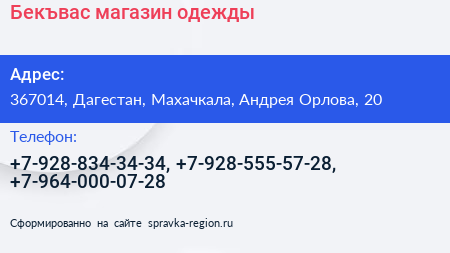Бекъвас, магазин одежды по адресу 367014, Дагестан, Махачкала, Андрея Орлова, 20 в дальнейшем Организация, размещена в следующих категориях: