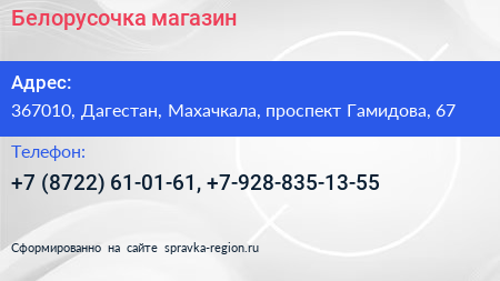 Белорусочка, магазин по адресу 367010, Дагестан, Махачкала, проспект Гамидова, 67 в дальнейшем Организация, размещена в следующих категориях: