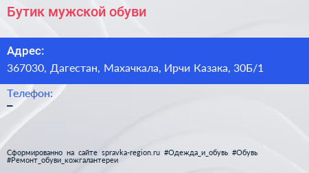 Бутик мужской обуви по адресу 367030, Дагестан, Махачкала, Ирчи Казака, 30Б/1 в дальнейшем Организация, размещена в следующих категориях: