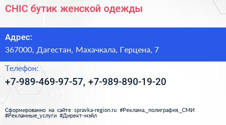 CHIC, бутик женской одежды по адресу 367000, Дагестан, Махачкала, Герцена, 7 в дальнейшем Организация, размещена в следующих категориях: