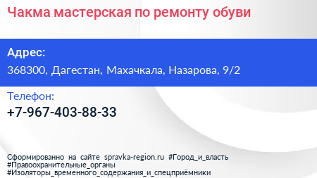 Чакма, мастерская по ремонту обуви по адресу 368300, Дагестан, Махачкала, Назарова, 9/2 в дальнейшем Организация, размещена в следующих категориях: