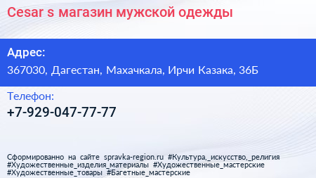 Cesar`s, магазин мужской одежды по адресу 367030, Дагестан, Махачкала, Ирчи Казака, 36Б в дальнейшем Организация, размещена в следующих категориях: