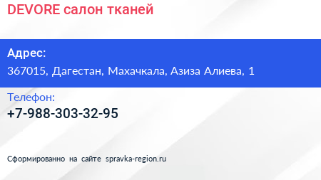 DEVORE, салон тканей по адресу 367015, Дагестан, Махачкала, Азиза Алиева, 1 в дальнейшем Организация, размещена в следующих категориях: