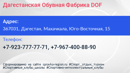 Дагестанская Обувная Фабрика DOF по адресу 367031, Дагестан, Махачкала, Юго-Восточная, 15 в дальнейшем Организация, размещена в следующих категориях: