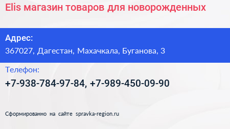 Elis, магазин товаров для новорожденных по адресу 367027, Дагестан, Махачкала, Буганова, 3 в дальнейшем Организация, размещена в следующих категориях: