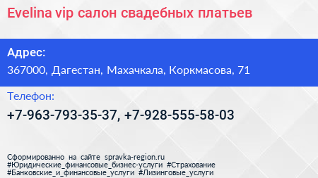 Evelina vip, салон свадебных платьев по адресу 367000, Дагестан, Махачкала, Коркмасова, 71 в дальнейшем Организация, размещена в следующих категориях: