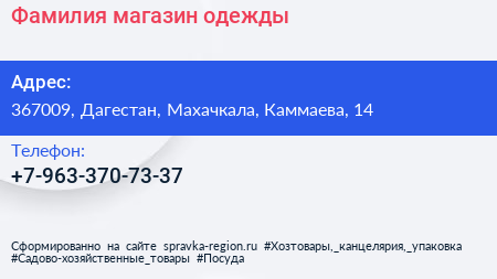 Фамилия, магазин одежды по адресу 367009, Дагестан, Махачкала, Каммаева, 14 в дальнейшем Организация, размещена в следующих категориях: