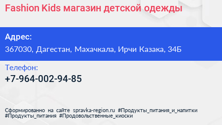 Fashion Kids, магазин детской одежды по адресу 367030, Дагестан, Махачкала, Ирчи Казака, 34Б в дальнейшем Организация, размещена в следующих категориях: