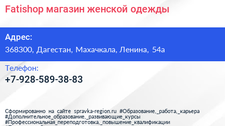 Fatishop, магазин женской одежды по адресу 368300, Дагестан, Махачкала, Ленина, 54а в дальнейшем Организация, размещена в следующих категориях: