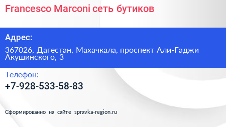 Francesco Marconi, сеть бутиков по адресу 367026, Дагестан, Махачкала, проспект Али-Гаджи Акушинского, 3 в дальнейшем Организация, размещена в следующих категориях: