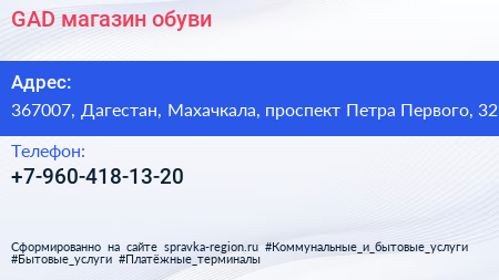 GAD, магазин обуви по адресу 367007, Дагестан, Махачкала, проспект Петра Первого, 32 в дальнейшем Организация, размещена в следующих категориях: