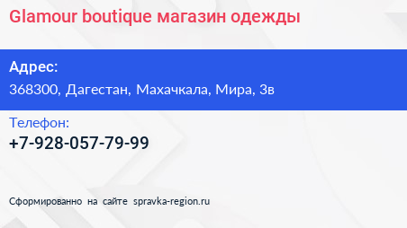 Glamour boutique, магазин одежды по адресу 368300, Дагестан, Махачкала, Мира, 3в в дальнейшем Организация, размещена в следующих категориях: