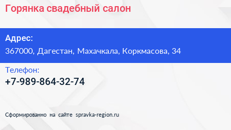 Горянка, свадебный салон по адресу 367000, Дагестан, Махачкала, Коркмасова, 34 в дальнейшем Организация, размещена в следующих категориях: