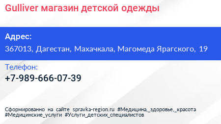 Gulliver, магазин детской одежды по адресу 367013, Дагестан, Махачкала, Магомеда Ярагского, 19 в дальнейшем Организация, размещена в следующих категориях: