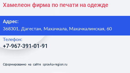 Хамелеон, фирма по печати на одежде по адресу 368301, Дагестан, Махачкала, Махачкалинская, 60 в дальнейшем Организация, размещена в следующих категориях: