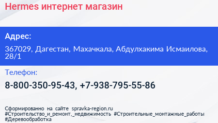 Hermes, интернет-магазин по адресу 367029, Дагестан, Махачкала, Абдулхакима Исмаилова, 28/1 в дальнейшем Организация, размещена в следующих категориях: