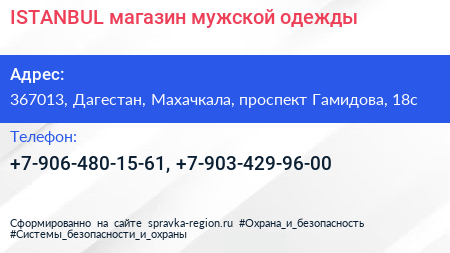 ISTANBUL, магазин мужской одежды по адресу 367013, Дагестан, Махачкала, проспект Гамидова, 18с в дальнейшем Организация, размещена в следующих категориях: