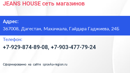 JEANS HOUSE, сеть магазинов по адресу 367008, Дагестан, Махачкала, Гайдара Гаджиева, 24Б в дальнейшем Организация, размещена в следующих категориях: