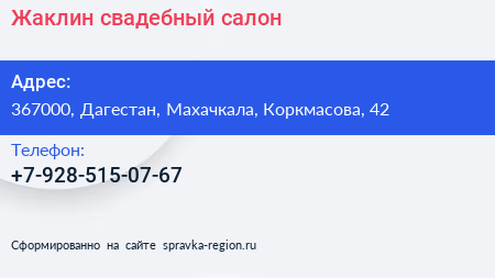 Жаклин, свадебный салон по адресу 367000, Дагестан, Махачкала, Коркмасова, 42 в дальнейшем Организация, размещена в следующих категориях: