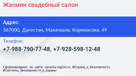 Жасмин, свадебный салон по адресу 367000, Дагестан, Махачкала, Коркмасова, 49 в дальнейшем Организация, размещена в следующих категориях:
