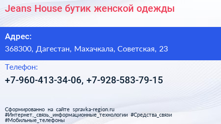 Jeans House, бутик женской одежды по адресу 368300, Дагестан, Махачкала, Советская, 23 в дальнейшем Организация, размещена в следующих категориях: