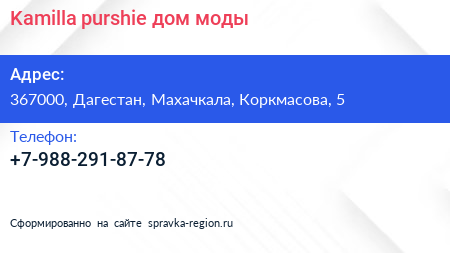 Kamilla purshie, дом моды по адресу 367000, Дагестан, Махачкала, Коркмасова, 5 в дальнейшем Организация, размещена в следующих категориях: