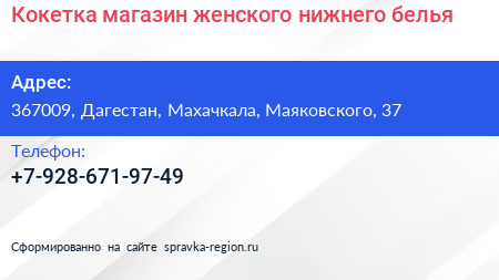 Кокетка, магазин женского нижнего белья по адресу 367009, Дагестан, Махачкала, Маяковского, 37 в дальнейшем Организация, размещена в следующих категориях: