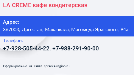 LA CREME, кафе-кондитерская по адресу 367003, Дагестан, Махачкала, Магомеда Ярагского, 94а в дальнейшем Организация, размещена в следующих категориях:
