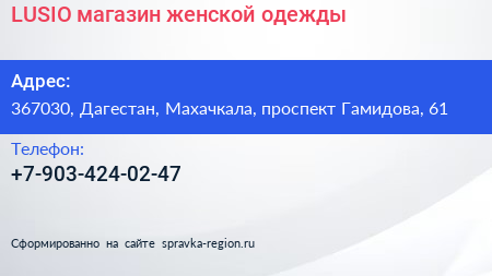LUSIO, магазин женской одежды по адресу 367030, Дагестан, Махачкала, проспект Гамидова, 61 в дальнейшем Организация, размещена в следующих категориях:
