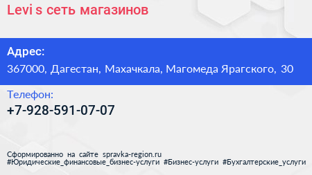 Levi`s, сеть магазинов по адресу 367000, Дагестан, Махачкала, Магомеда Ярагского, 30 в дальнейшем Организация, размещена в следующих категориях: