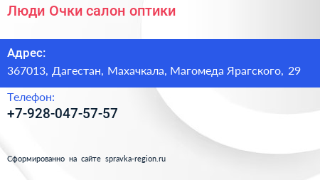 Люди & Очки, салон оптики по адресу 367013, Дагестан, Махачкала, Магомеда Ярагского, 29 в дальнейшем Организация, размещена в следующих категориях: