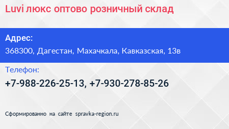 Luvi люкс, оптово-розничный склад по адресу 368300, Дагестан, Махачкала, Кавказская, 13в в дальнейшем Организация, размещена в следующих категориях:
