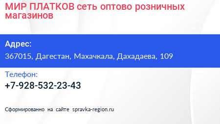 МИР ПЛАТКОВ, сеть оптово-розничных магазинов по адресу 367015, Дагестан, Махачкала, Дахадаева, 109 в дальнейшем Организация, размещена в следующих категориях: