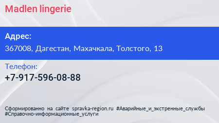 Madlen lingerie по адресу 367008, Дагестан, Махачкала, Толстого, 13 в дальнейшем Организация, размещена в следующих категориях: